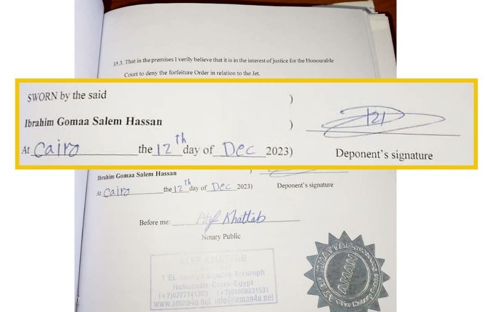 الوثائق التي حصلت عليها الشبكة بالتعاون مع مؤسسة “مكافحة الجريمة المنظمة والفساد (OCCRP)، أوضحت أن العرجاني قدم إفادة خطية إلى المحكمة العليا في زامبيا في ديسمبر/كانون الأول 2023، وعرّف نفسه بأنه مالك الطائرة.