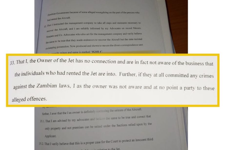 وفي الإفادة الخطية، يقول العرجاني إنه لا هو ولا شركة إدارة الطائرة، إيبيس إير، كان لهما أي صلة بالمصريين الذين استأجروا الرحلة من القاهرة إلى لوساكا.