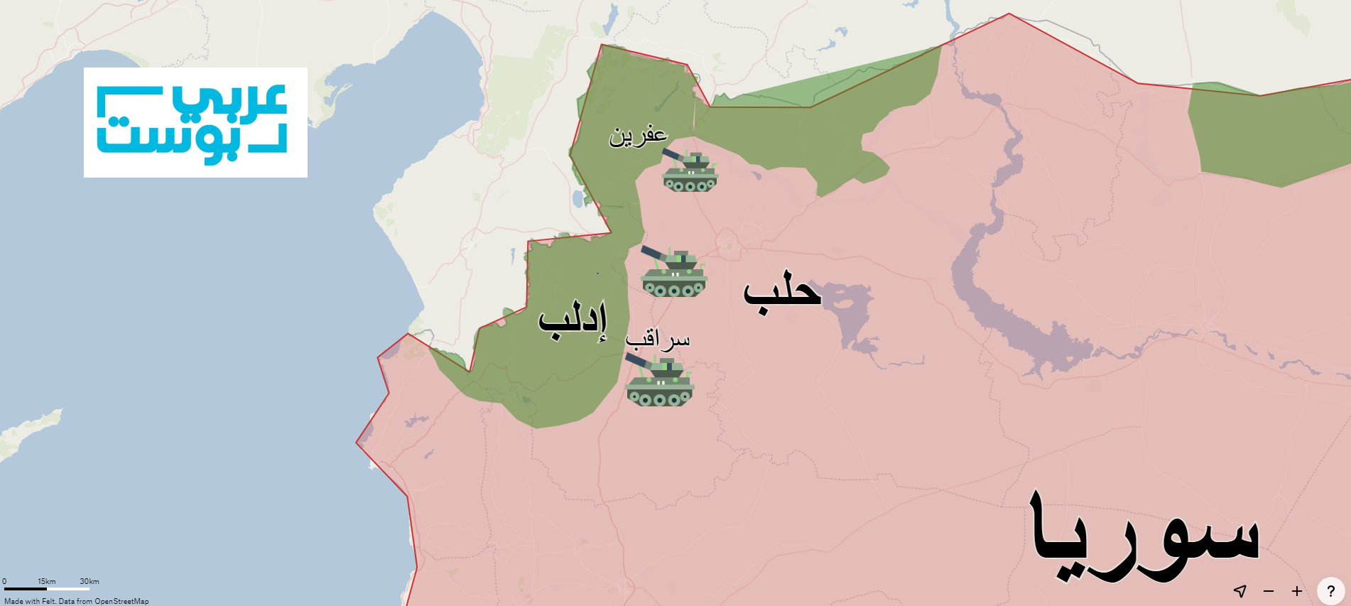 وتمتد نقطة التماس بين المناطق التابعة للنظام السوري والمعارضة السورية المسلحة من منطقة سراقب شرق محافظة إدلب وصولًا إلى حدود منطقة عفرين شمال وغرب حلب.