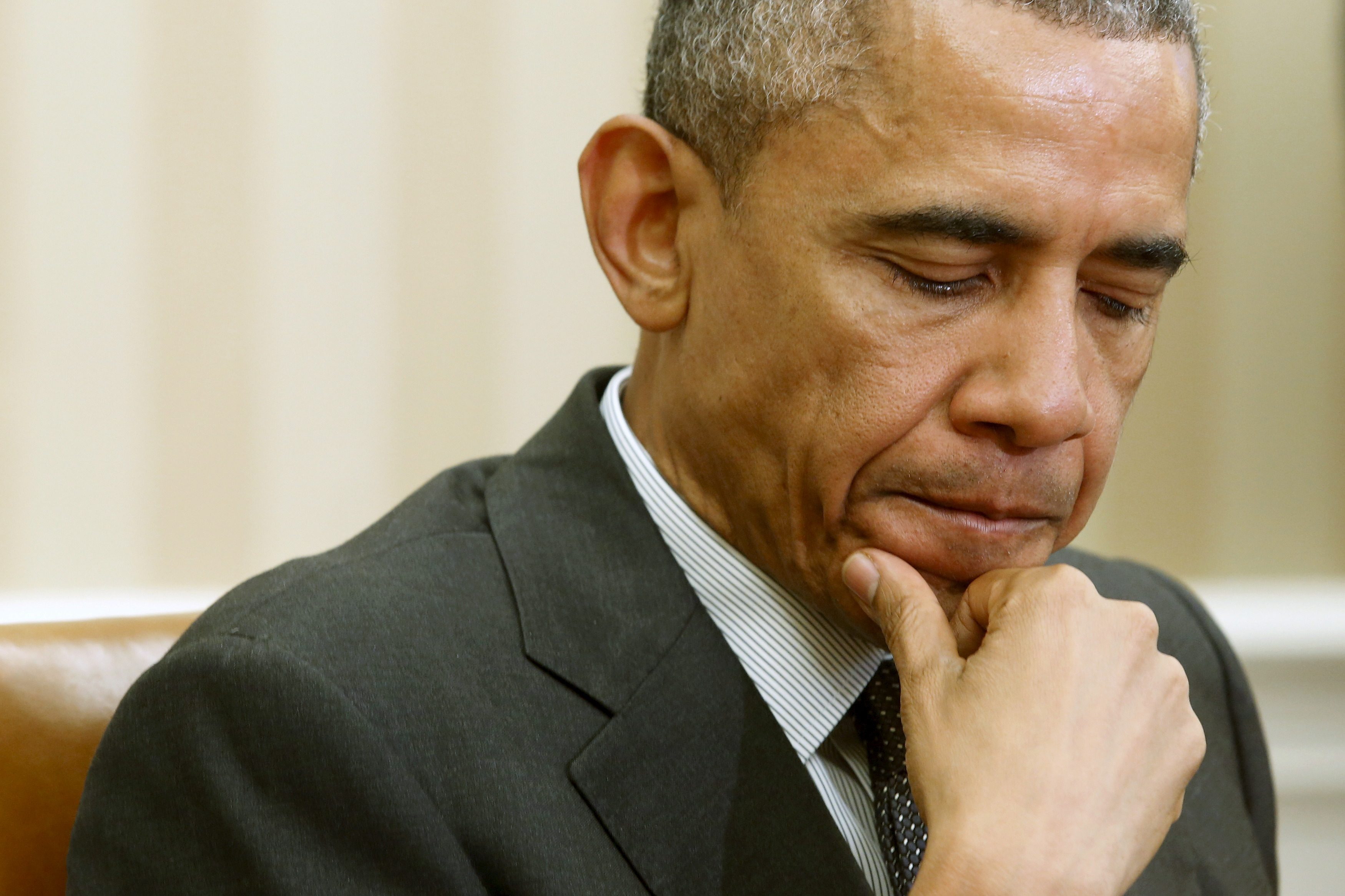 U.S. President Barack Obama listens to remarks to reporters by Iraq's Prime Minister Haider Al-Abadi after their bilateral meeting in the Oval Office at the White House in Washington April 14, 2015. REUTERS/Jonathan Ernst