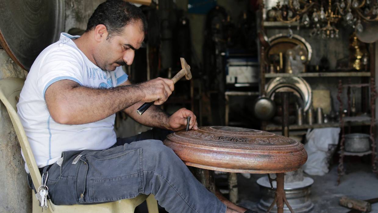 أحمد غزول يعمل على قطعة من النحاس في سوق النحاس الذي تم تجديده حديثًا في حلب/ AP