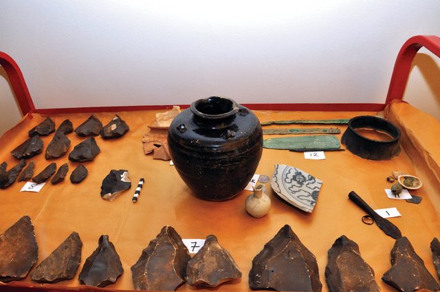 وتشمل هذه القطع الأثرية، ثلاثيات الفصوص، وأنياب، وجماجم، وفكوك حيوانات، ورؤوس سهام، وأدوات بدائية، ونقوش صخرية.