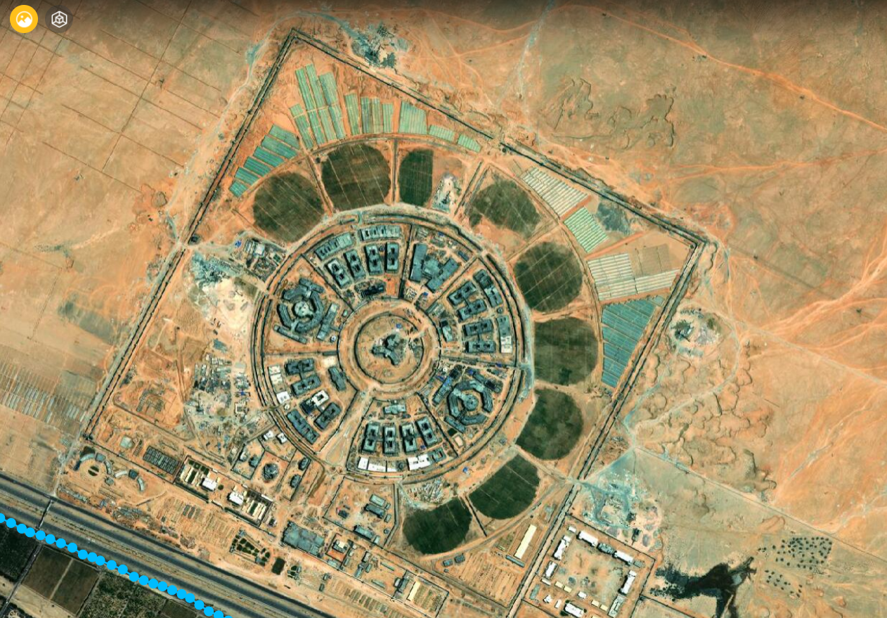 ظهرت ملامح بناء مجمع السجون لأول مرة على صور الأقمار الصناعية بتاريخ 27 نوفمبر/تشرين الثاني 2020، وقبل هذا التاريخ كان مكان بناء المجمع عبارة عن أراضٍ زراعية فقط، ومع استمرار العمل ببناء المجمع كانت مبانيه العالية بدأت تظهر للمسافرين على الطريق الصحراوي بحلول فبراير/شباط الماضي.