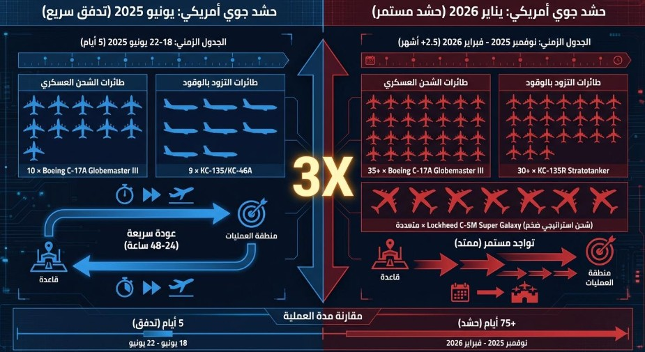 غير أن الفارق الأكثر دلالة لا يكمن في العدد فقط، بل في الزمن؛ فبينما انتهى حشد يونيو/ حزيران خلال 5 أيام، يتواصل الحشد الحالي منذ منتصف نوفمبر/ تشرين الثاني 2025 وحتى فبراير/ شباط 2026 دون انقطاع. هذا الامتداد الزمني، الذي يتجاوز الشهرين ونصف الشهر، لا يعكس تضخيماً كمياً فحسب، بل يشير إلى تحول نوعي في طبيعة الاستعداد العسكري الأمريكي.
