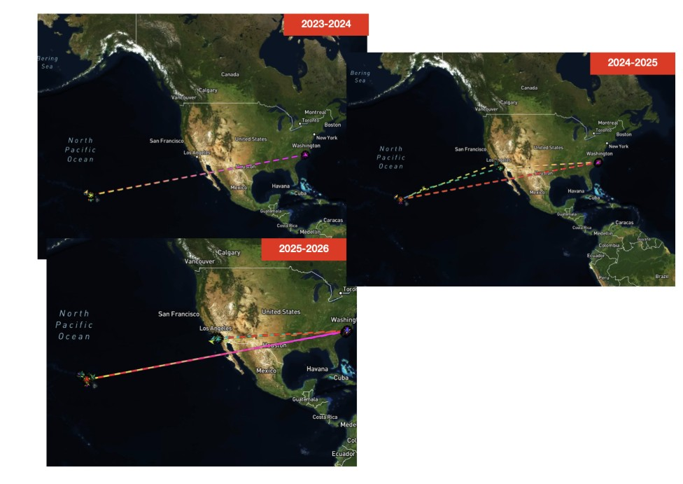 يُظهر تتبع مسارها السابق أنها غادرت سان دييغو في أبريل/ نيسان 2025، قبل أن تصل إلى البحرين في سبتمبر/ أيلول، أي قبل أكثر من شهرين من بدء الحشد الجوي والبحري الكبير. هذا التوقيت المبكر يعكس تمهيداً عملياتياً طويل الأمد.
