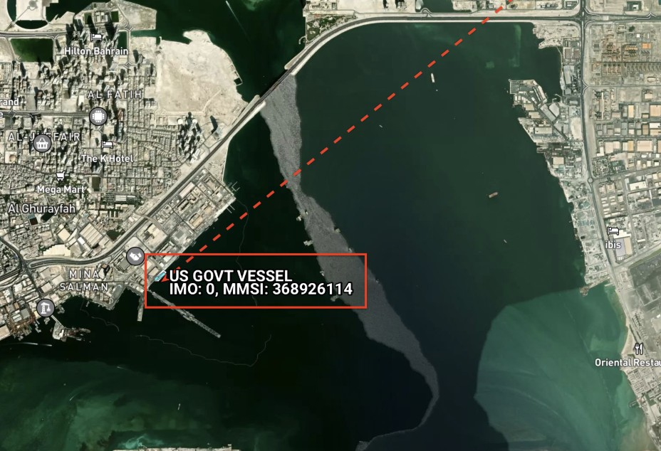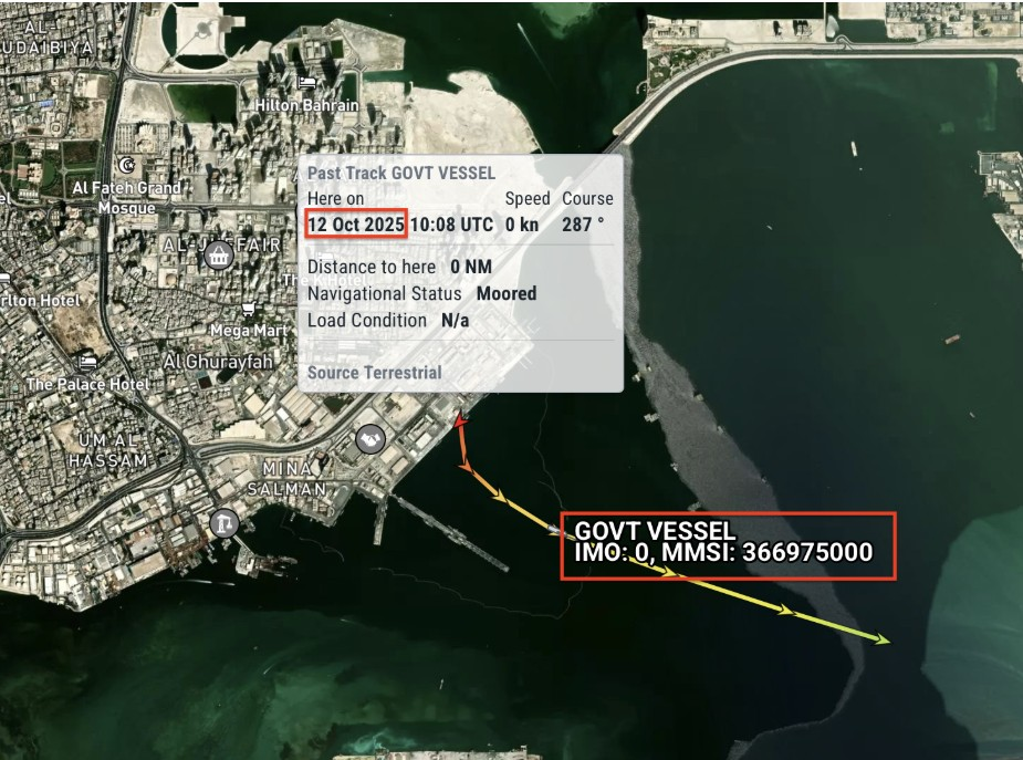 ظهرت السفينة USS Tulsa (MMSI: 368926114) على الرادار في 10 أكتوبر/ تشرين الأول 2025 وهي ترسو في ميناء سلمان البحري في البحرين، مقر الأسطول 5 الأمريكي.