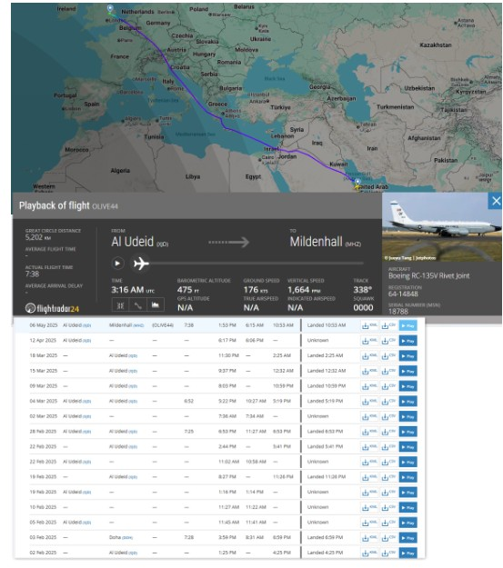 مثال ثانٍ على هذا النمط يعود إلى يونيو/ حزيران 2025، حين نفذت طائرات RC-135 مهام استطلاع إلكتروني قصيرة قبيل الضربة الإسرائيلية–الأمريكية على إيران، ثم غادرت المنطقة قبل تنفيذ العملية بساعات. يومها كانت المهمة محددة زمنياً: جمع إشارات، تحليل اتصالات، ثم انسحاب.