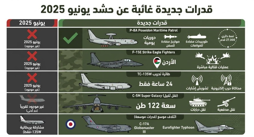 رغم أن حشد يونيو/ حزيران 2025 شمل 3 طائرات استطلاع إلكتروني من طراز "RC-135 Rivet Joint" مقابل طائرة واحدة حالياً، إلا أن الحشد الراهن يعوض ذلك بقدرات نوعية جديدة تماماً. أبرز هذه القدرات هي طائرات P-8A Poseidon للدوريات البحرية، التي كانت غائبة عن حشد يونيو/ حزيران.