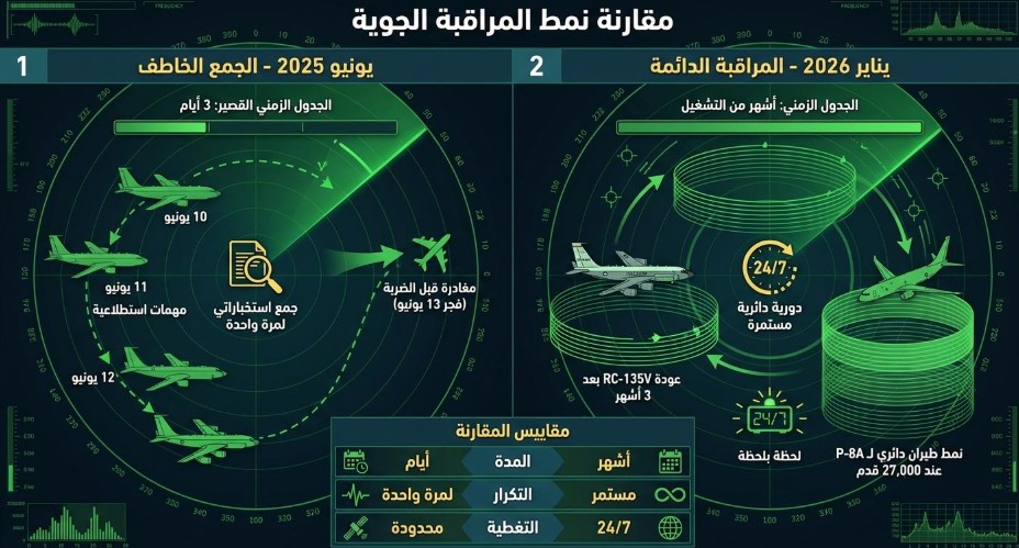 أما في يناير/ كانون الثاني 2026، فعودة الطائرة نفسها إلى المجال العملياتي تعني انتقالاً من "الاستطلاع قبل الضربة" إلى "المراقبة المستمرة".