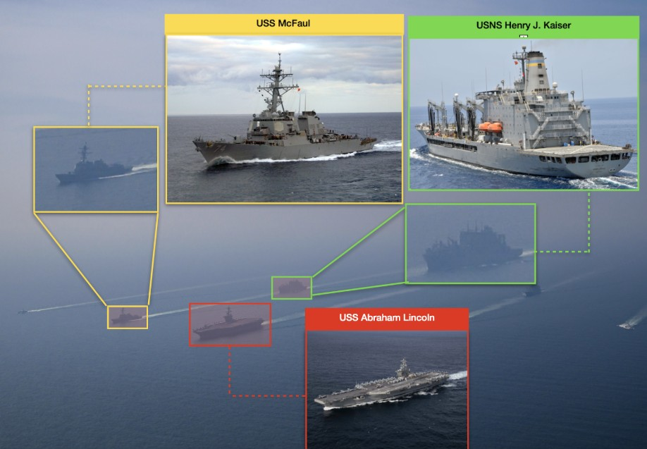 رغم أن صور القيادة المركزية أظهرت مرافقة محدودة، فإن تتبع بيانات الرادار والملاحة البحرية كشف أن مجموعة الحاملة أوسع بكثير ما أُعلن. إذ رصد فريق التحقيق مدمرات إضافية وسفن دعم سلكت المسار ذاته الذي اتخذته الحاملة، انطلاقاً من الساحل الغربي الأمريكي، مروراً بالمحيط الهادئ، ثم مضيق ملقا، وصولاً إلى بحر العرب.