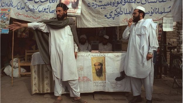 أعلن أسامة بن لادن الحرب على الولايات المتحدة من كهف في تورا بورا في فبراير/شُباط عام 1996. وأظهرت الصور رجلاً له لحية تصل إلى صدره. كان يرتدي جلباباً تحت زي القتال.