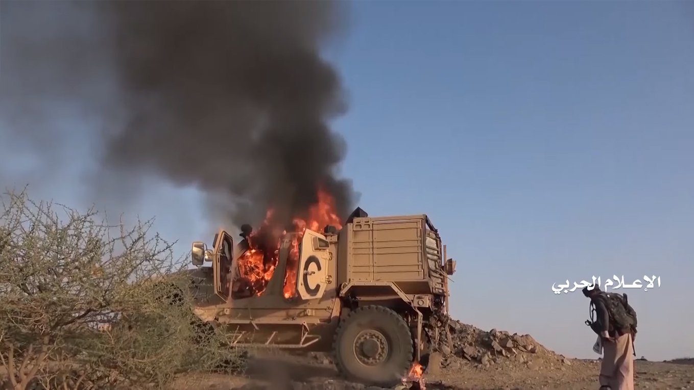 وأظهرت تلك المشاهد تقدُّم مقاتلين مسلحين بالكلاشينكوف في الجبال، وسير دبابات في صف على طريق ممهد بين الصخور. ويُصيب صاروخ مضاد للدبابات إحدى المدرعات التي تنفجر، ويتوجه طاقم الدبابة المكون من خمسة رجال إلى المقاتلين الحوثيين، ويطلق المقاتلون صيحات “الله أكبر” و “الموت لإسرائيل”، وتختلط الأبخرة مع الغبار. ثم أُطلقت الصواريخ الباليستية بشكل مُتتالٍ مخلِّفةً خطوطاً من النيران في السماء السوداء، ويتقدم الأسرى في حالة من الاضطراب في خطوط طويلة.