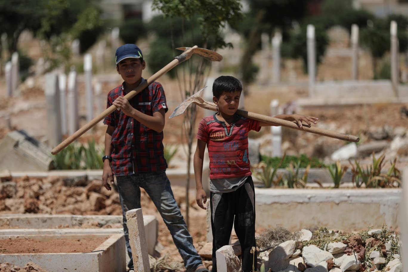ويعمل الطفلان مع والدهما غسان في المقبرة الواقعة على مشارف إدلب، وقُتِل ما يزيد على 500 شخص، من بينهم 130 طفلاً، خلال الشهرين الماضيين في هجوم شنَّه النظام السوري وروسيا على محافظة إدلب، آخر معاقل المعارضة.