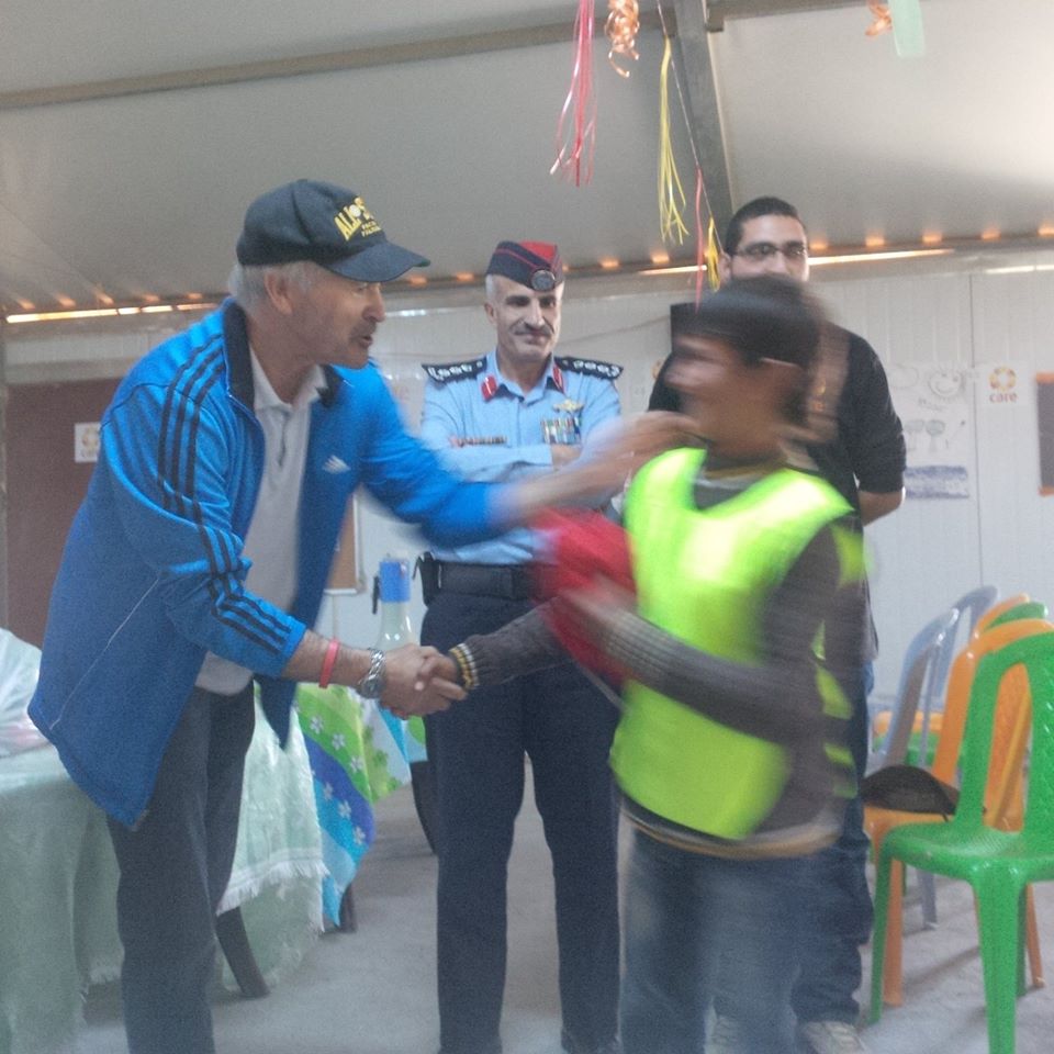 عثر فوكس على متجر في لوس أنجلوس يبيع القمصان الرياضية القديمة، واستطاع شراء 180 قميصاً. توجَّه فوكس وأنغيلسون بعد ذلك إلى الأردن، وتحديداً إلى مخيم “الأزرق” الذي افتُتح مؤخراً. كانت الأوضاع هناك مزرية حقاً. لا توجد كهرباء، وثمّة مياه قليلة يعيش عليها حوالي 10 آلاف نسمة. ومع ذلك تحسَّنت الأجواء سريعاً عندما وصل فوكس إلى المخيم لتوزيع القمصان الرياضية. اصطفّ الأطفال من جميع الأعمار لتسلم القمصان، ووجّهوا التحية له ولصديقه أنغيلسون من خلال المصافحة بالأيدي والأحضان الدافئة. يقول فوكس: “لقد تأثرنا جداً بهذا الموقف”.