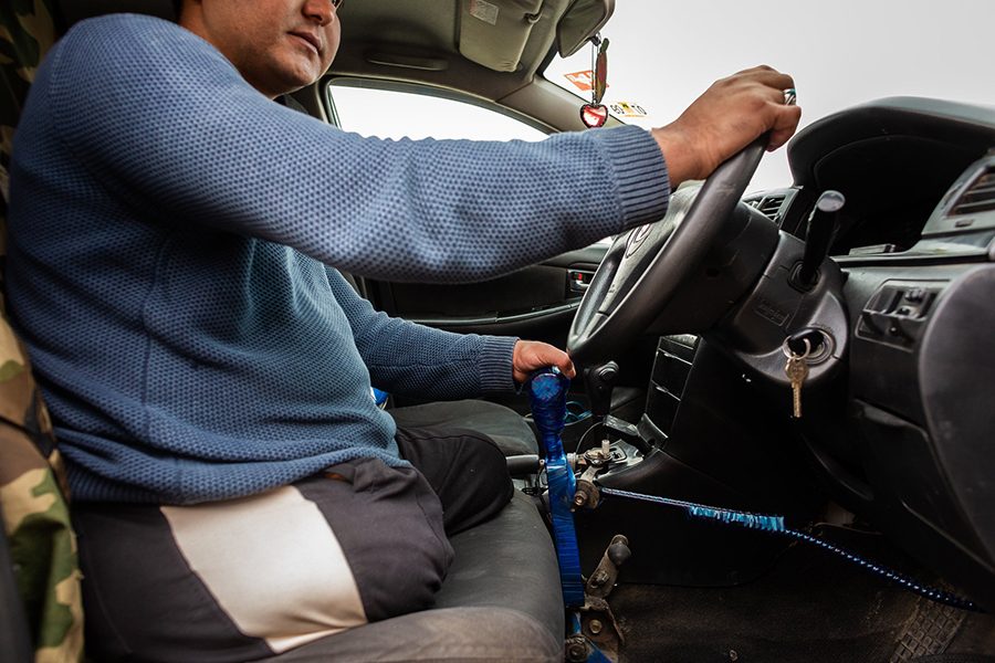 جهّز الرجلان جهازاً غريباً يمكِّن حيدري من توجيه عجلة القيادة بيده اليمنى السليمة والدواسة بإبهامه الأيسر، الذي يتحكم في مقبض. ويستخدم الإبهام أيضاً للضغط على الفرامل، عن طريق دفع مقبض ملفوف بشريط أزرق. كلفته التعديلات 5500 أفغاني، أو نحو 70 دولاراً.