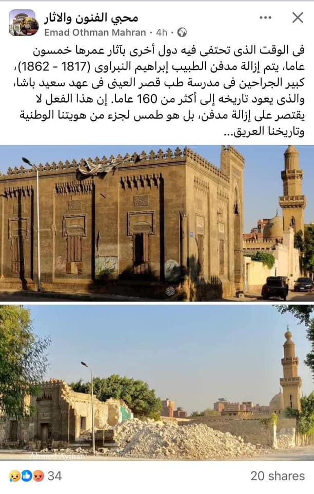 وقال إن المشكلة في إهمال الحكومة لتراثها التاريخي ولا يجب أن يتم التعامل معه بالهدم، كما أن الهدم هو الإجراء الوحيد الذي لا يمكن إصلاحه وبعد أن تحول “مدفن مستولدة محمد علي باشا” إلى ركام من المستحيل إعادته مرة أخرى.