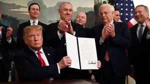 حيث وقع ترامب في 25 مارس/ آذار 2019، على إعلان رئاسي، اعتبر أن منطقة الجولان المحتل جزء من إسرائيل.