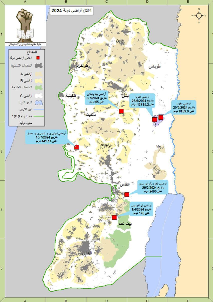 حيث شهد العام 2024، أكبر عملية استيلاء تحت مسمى “أراضي الدولة” منذ سنوات طويلة تصل إلى ثلاثة عقود، حيث بلغت المساحات التي استولى عليها الاحتلال تحت هذا المسمى ما مجموعه 24.144 دونماً في ستة إعلانات منفصلة.