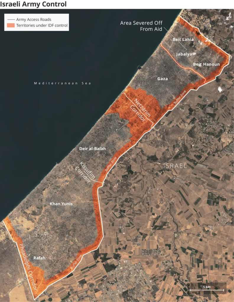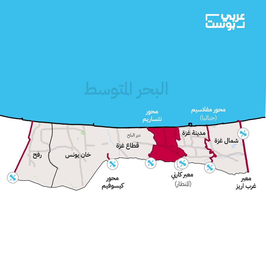 حيث سيصبح محور تقطيع رابع يضاف إلى “مفلاسيم” و”نتساريم” و”فيلادلفيا”، وما يعزز من هذه النظرة أن الجيش الإسرائيلي نفذ خلال الأشهر الماضية هجمات جوية مكثفة وعمليات عسكرية برية واسعة في المنطقة المقابلة لمعبر “كيسوفيم” ضمن خط متعرج وصولاً إلى شاطئ البحر غرباً، ودُمرت غالبية المنازل في المحور الذي كان يشكل “الأصبع الثالث” من خطة الأصابع.