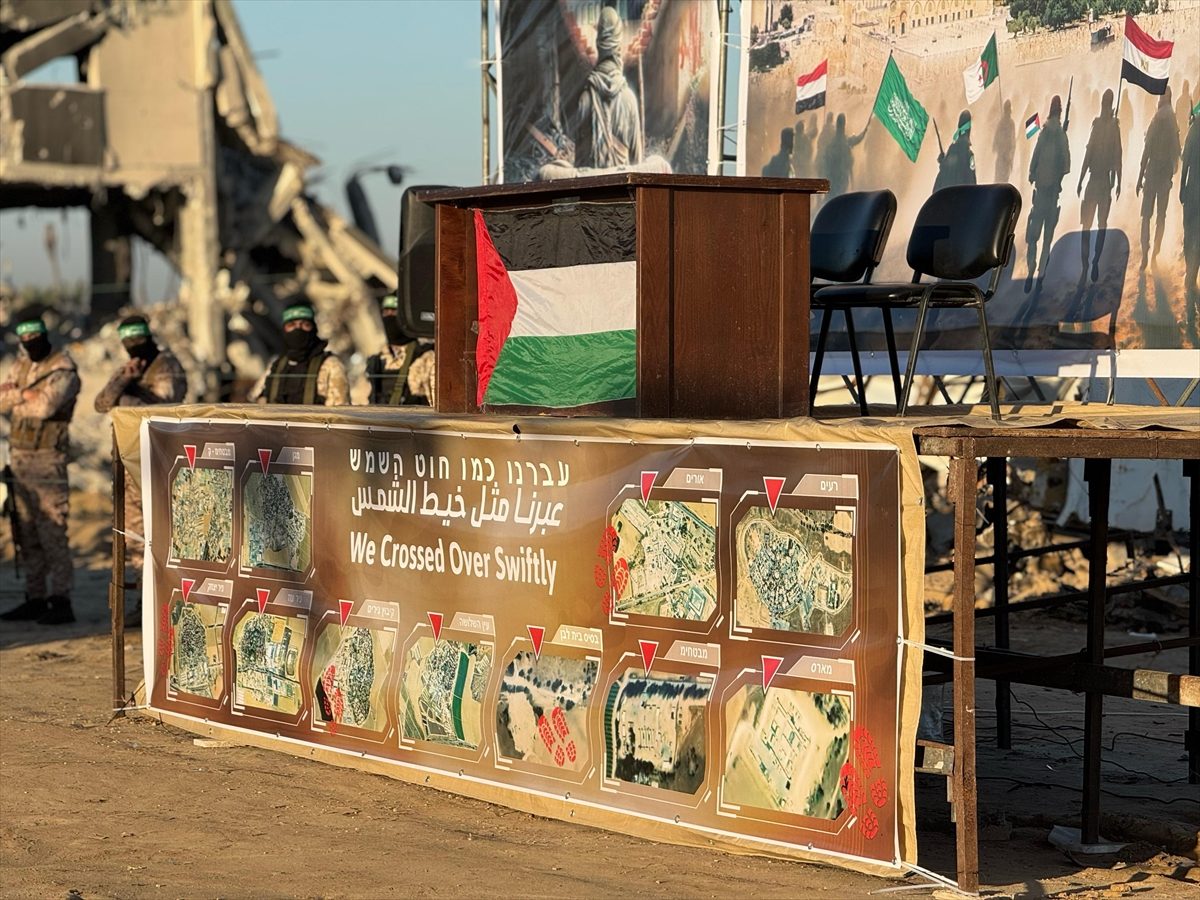 وكان لافتاً في عملية تسليم الدفعة السادسة، وضع ملصقات في أسفل المنصة، وتعليق “عبرنا مثل خيط الشمس” في إشارة إلى هجوم “طوفان الأقصى” الذي بدأ مع شروق الشمس في 7 أكتوبر/تشرين الأول 2023.