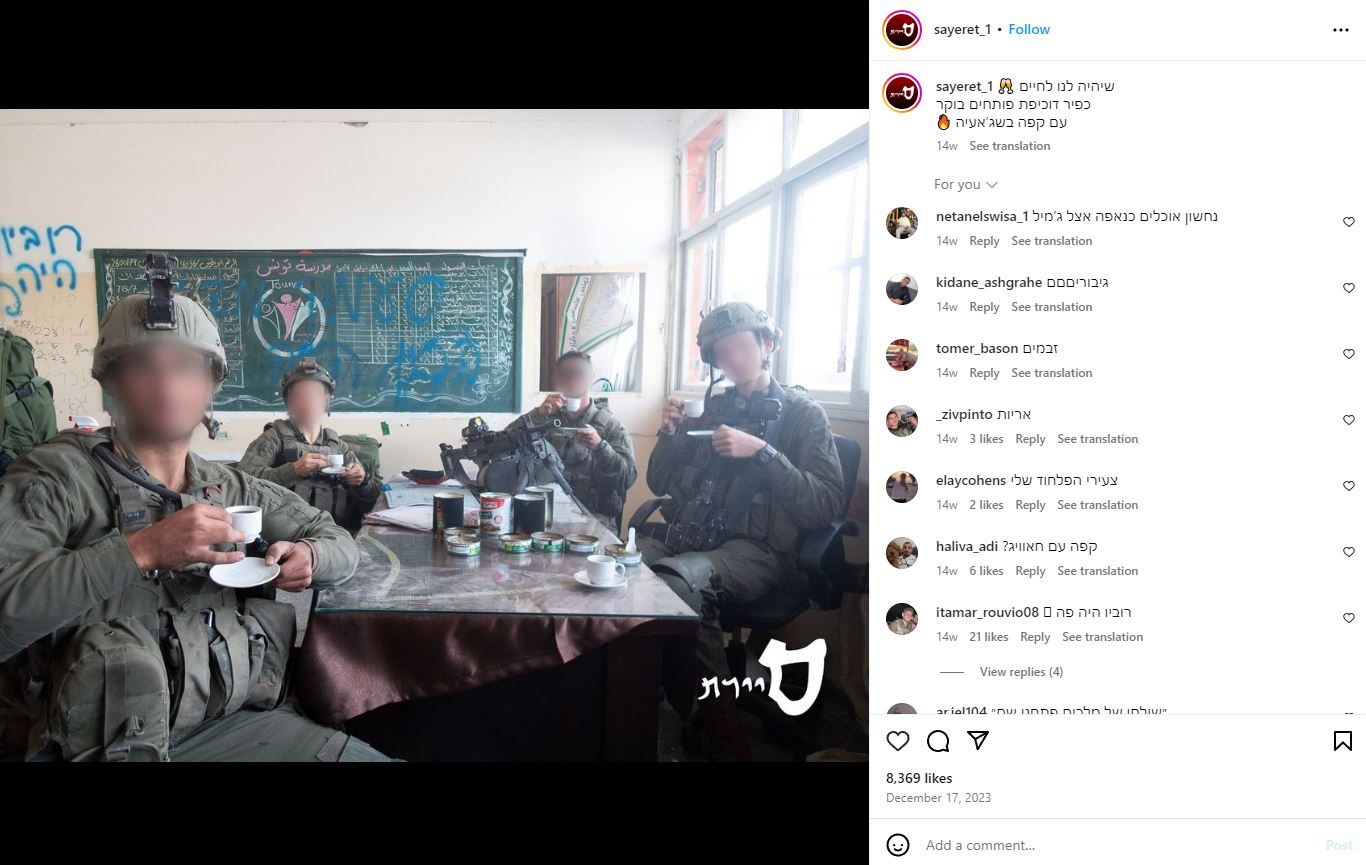 الجندي الإسرائيلي “شلومي أمسلي” نشر يوم 30 يناير 2024، صورة تظهر تجميع عدد من النازحين الفلسطينيين في غزة عند نقطة عسكرية إسرائيلية، ونشر شلومي على حسابه في فيسبوك صورة مسيئة لهم بينما كانوا ينظرون إليه، وكان من بينهم أطفال ونساء.
