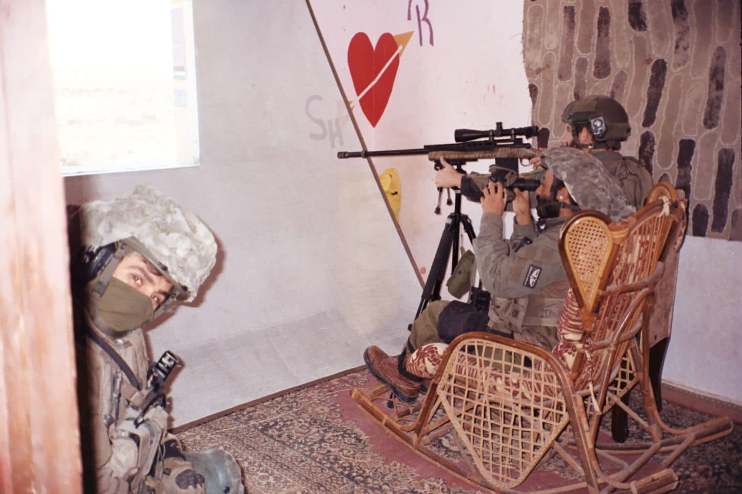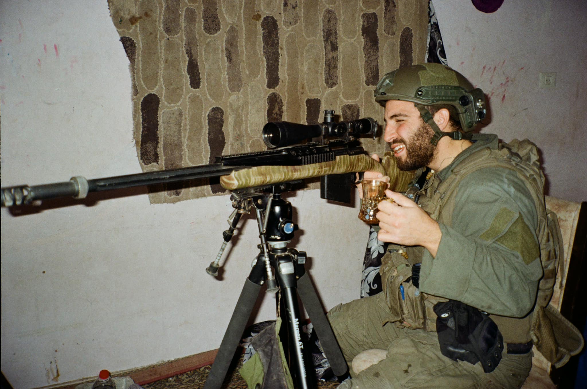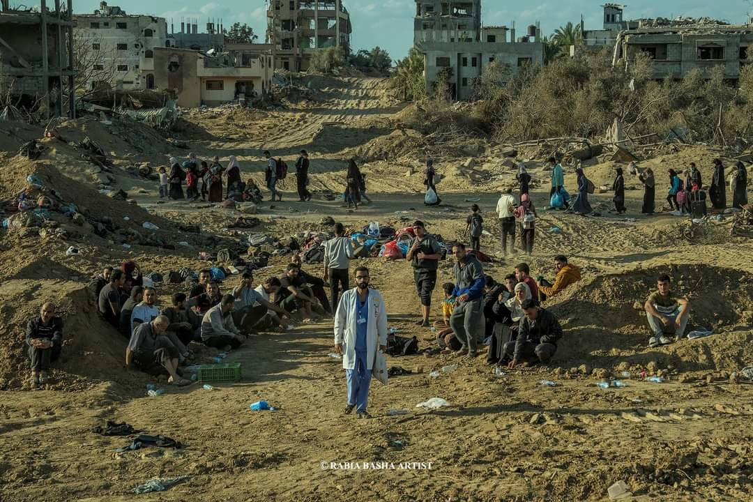 في صورة أخرى نشرها الجندي شلومي، يظهر فيها نازحون فلسطينيون بغزة، وصور شلومي منظار سلاح تم تصويبه نحو النازحين مباشرة.