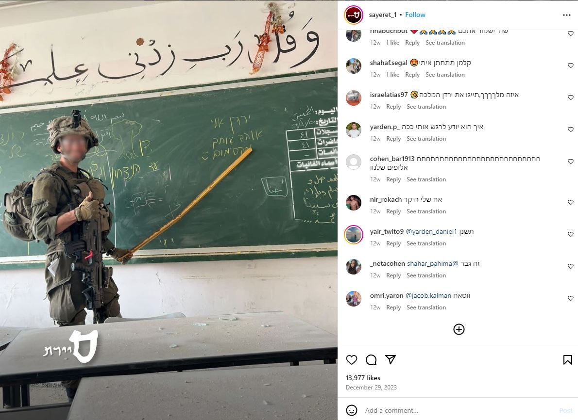 مقطع فيديو نشره جندي إسرائيلي اسمه “يشيل فيشمان” على حسابه في فيسبوك في فبراير/ شباط 2024، يظهر تواجداً لقوات الاحتلال داخل مدرسة امتلأت جدرانها بأثار الرصاص، ويظهر الفيديو أحد الصفوف الذي كانت الكتابة بالعربية بادية فيه على السبورة، لكن الصف بدا مدمراً.