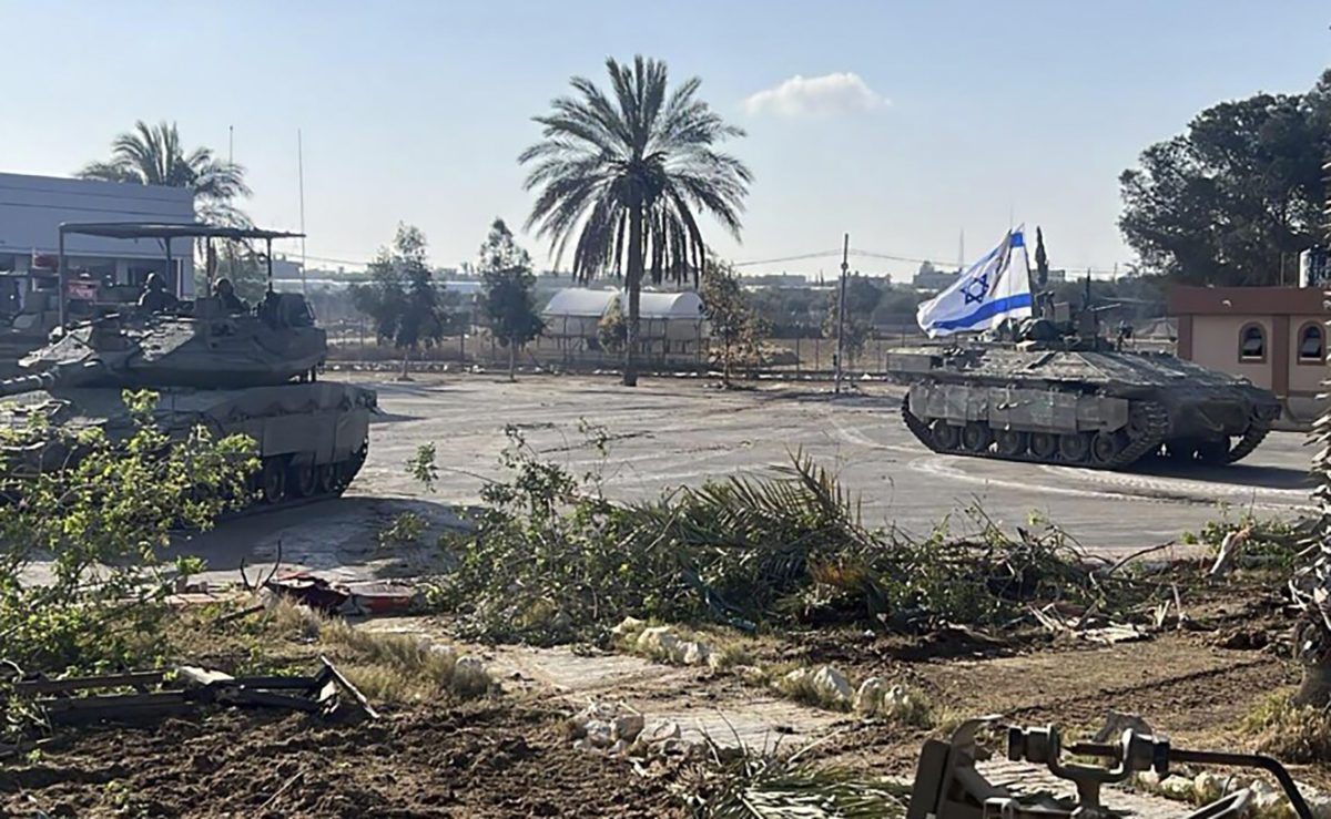 صورة نشرها جيش الاحتلال الإسرائيلي لاقتحام معبر رفح حيث تظهر دبابة ترفع علم الاحتلال داخل باحات المعبر المدمرة/ جيش الاحتلال