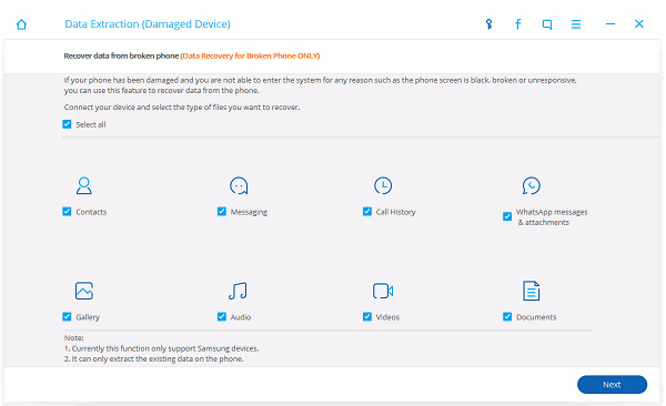 قم بتثبيت البرنامج والدخول على خيار Android Broken Data Recovery لاختيار البيانات المراد استعادتها مثل جهات الاتصال والرسائل النصية والفيديوهات ورسائل واتساب وغيرها.