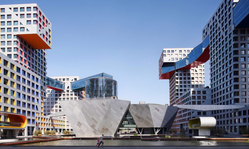 وهناك، تقبع ثماني ناطحات سحاب على ضفاف النهر، اثنتان منها على ارتفاع 350 متراً، بينما يبلغ ارتفاع الست الأخريات 250 متراً.