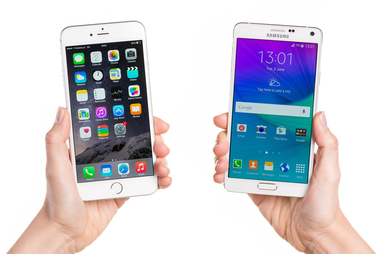 Koszalin, Poland - Jun 01, 2015: Close-up shot of white iPhone 6 Plus and white Samsung Galaxy Note 4 hand-held by woman. IPhone 6 Plus (5.5 inches) is biggest smartphone from Apple. Samsung Galaxy Note 4 is his competitor from Samsung. Devices displaying the applications on the home screen.