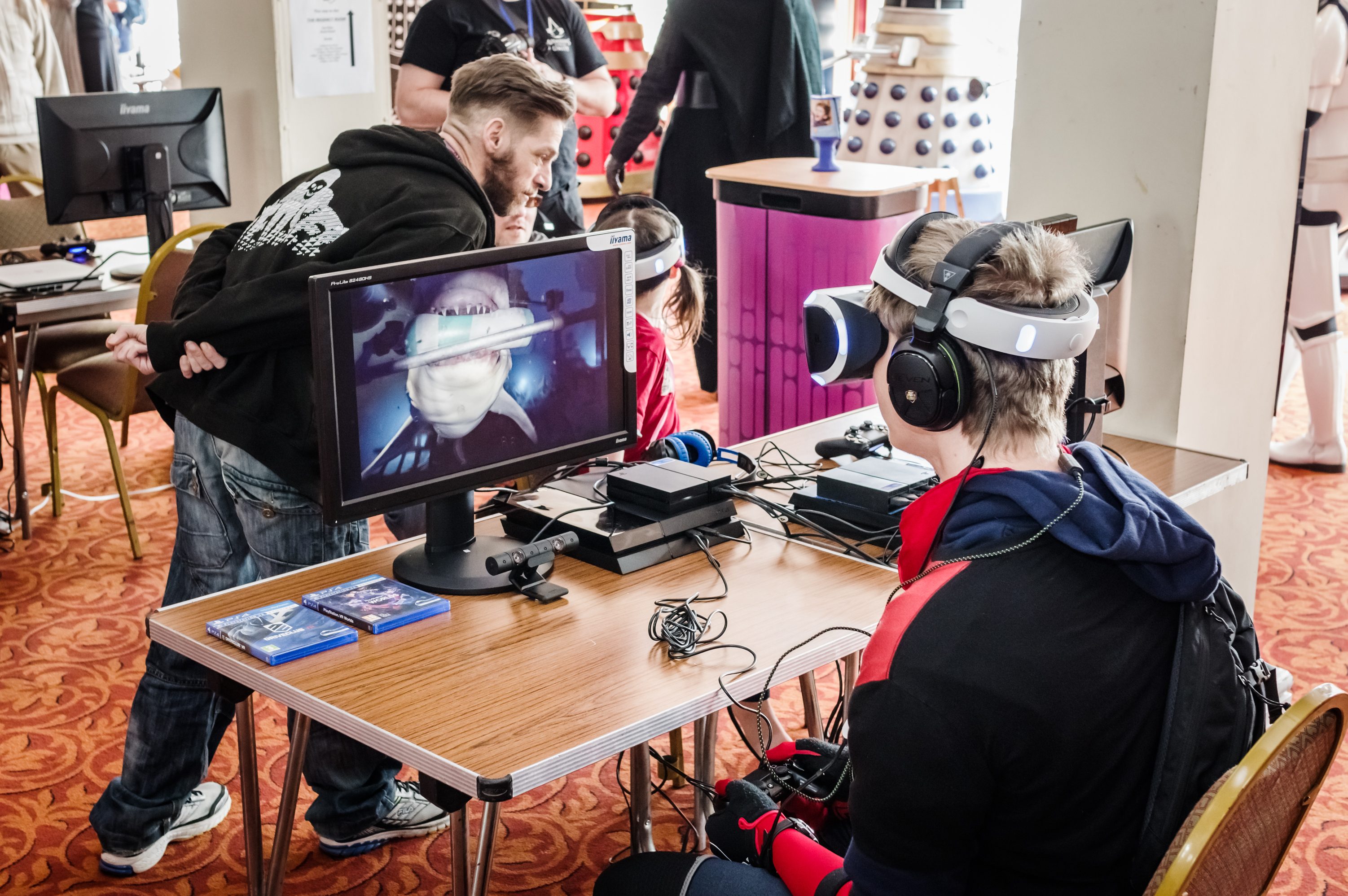 Attendees at Sci-Fi Scarborough trying out Playstation VR virtual reality sets.