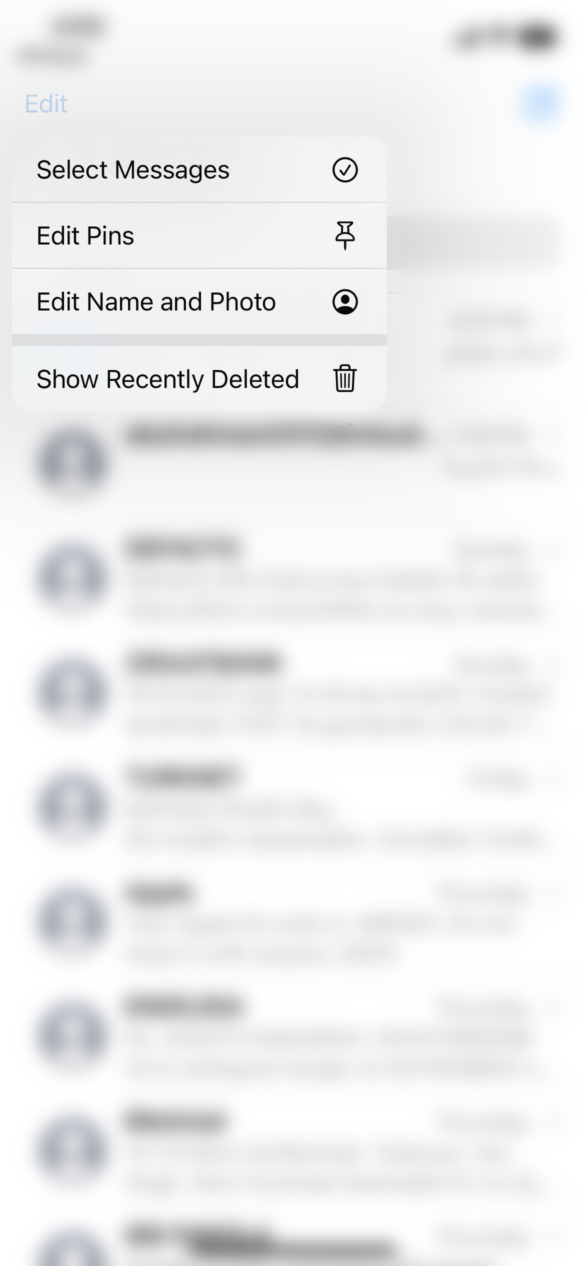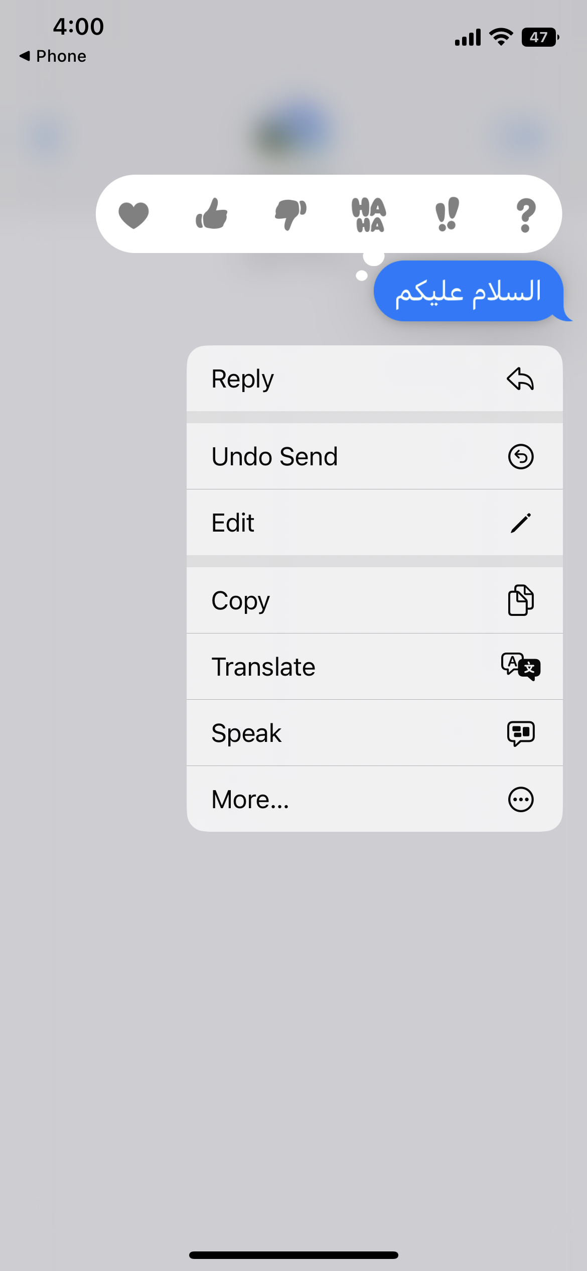 القائمة بعد الضغط المطول على الرسالة المراد تعديلها