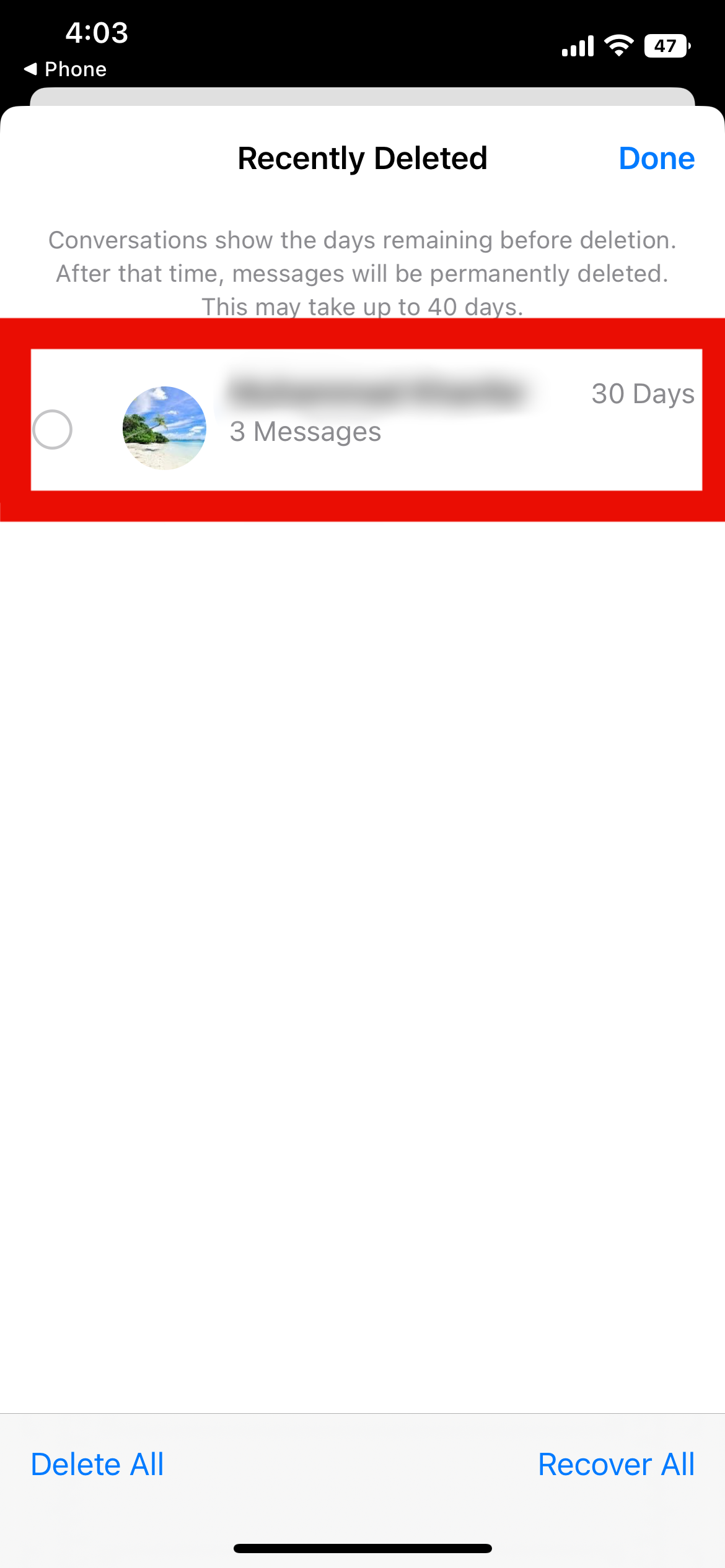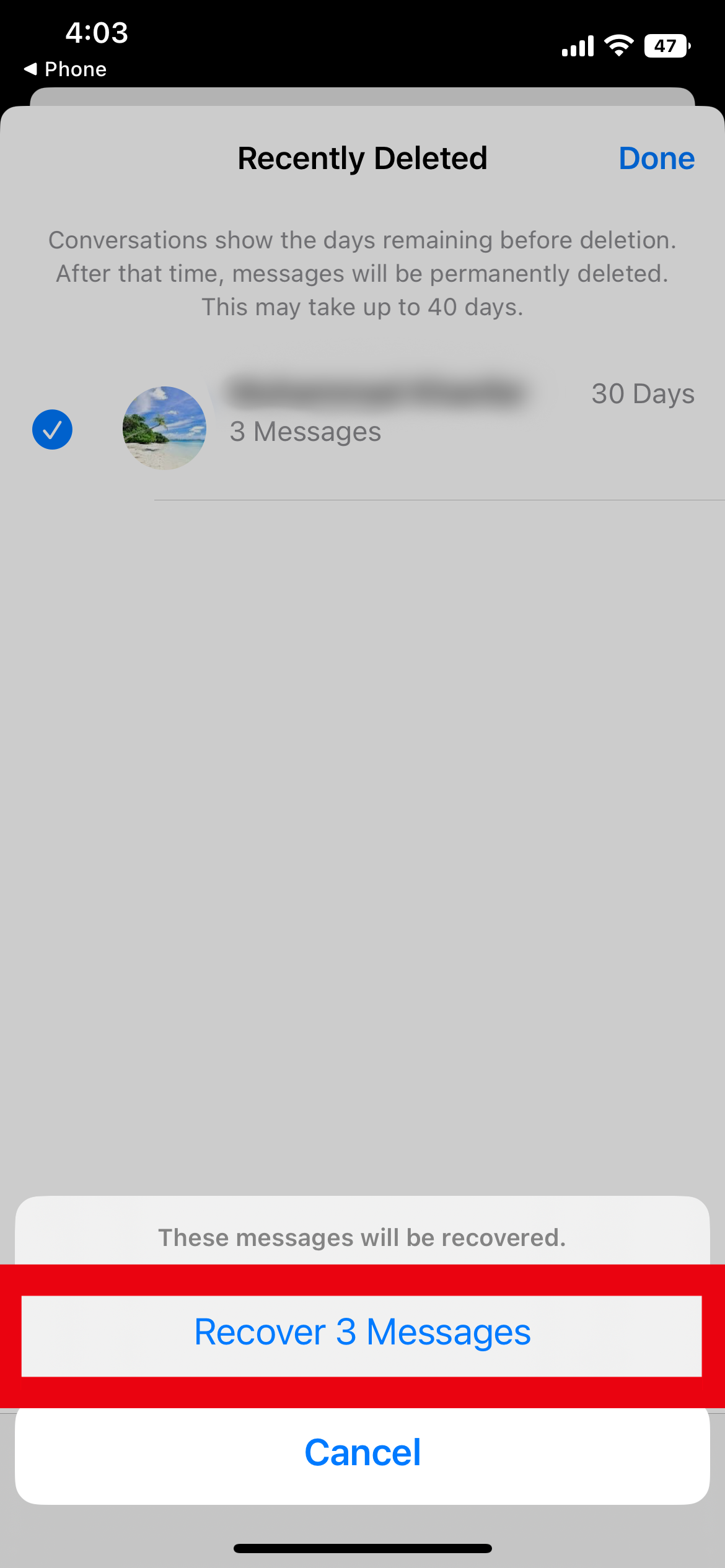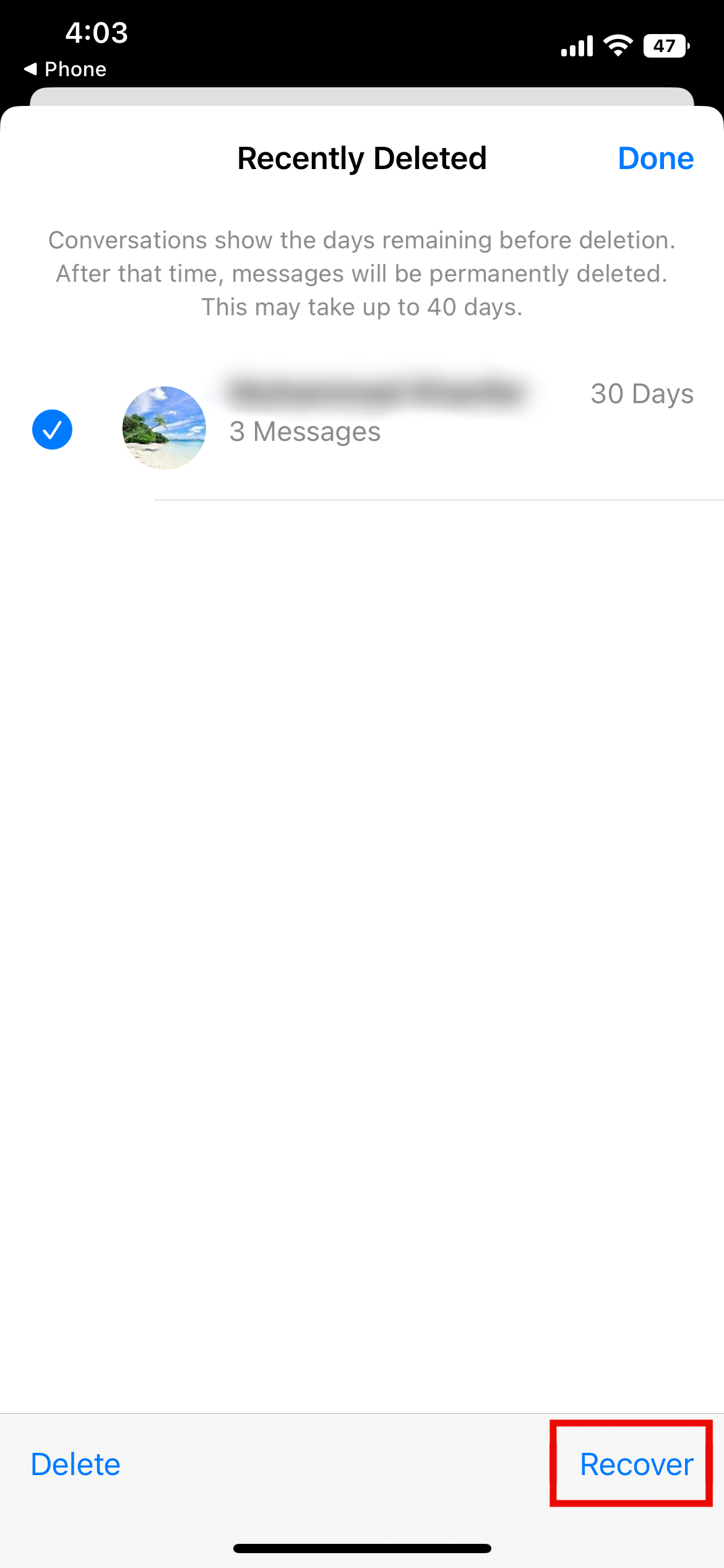 3 اختر المحادثة أو المحادثات التي تحتوي على الرسائل المُراد استردادها.