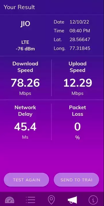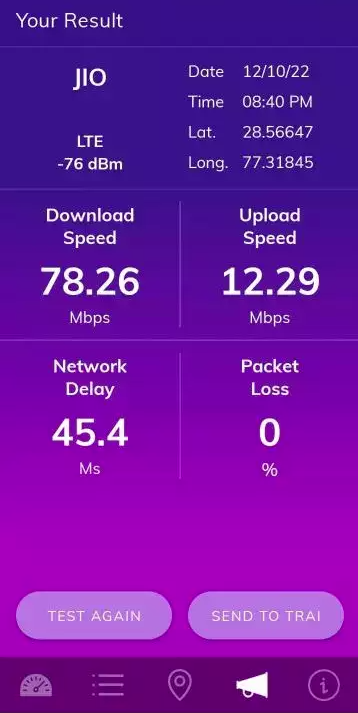 4. تستطيع الآن اختيار “إعادة الاختبار Test Again” أو “إرسال النتائج Send to TRAI”.