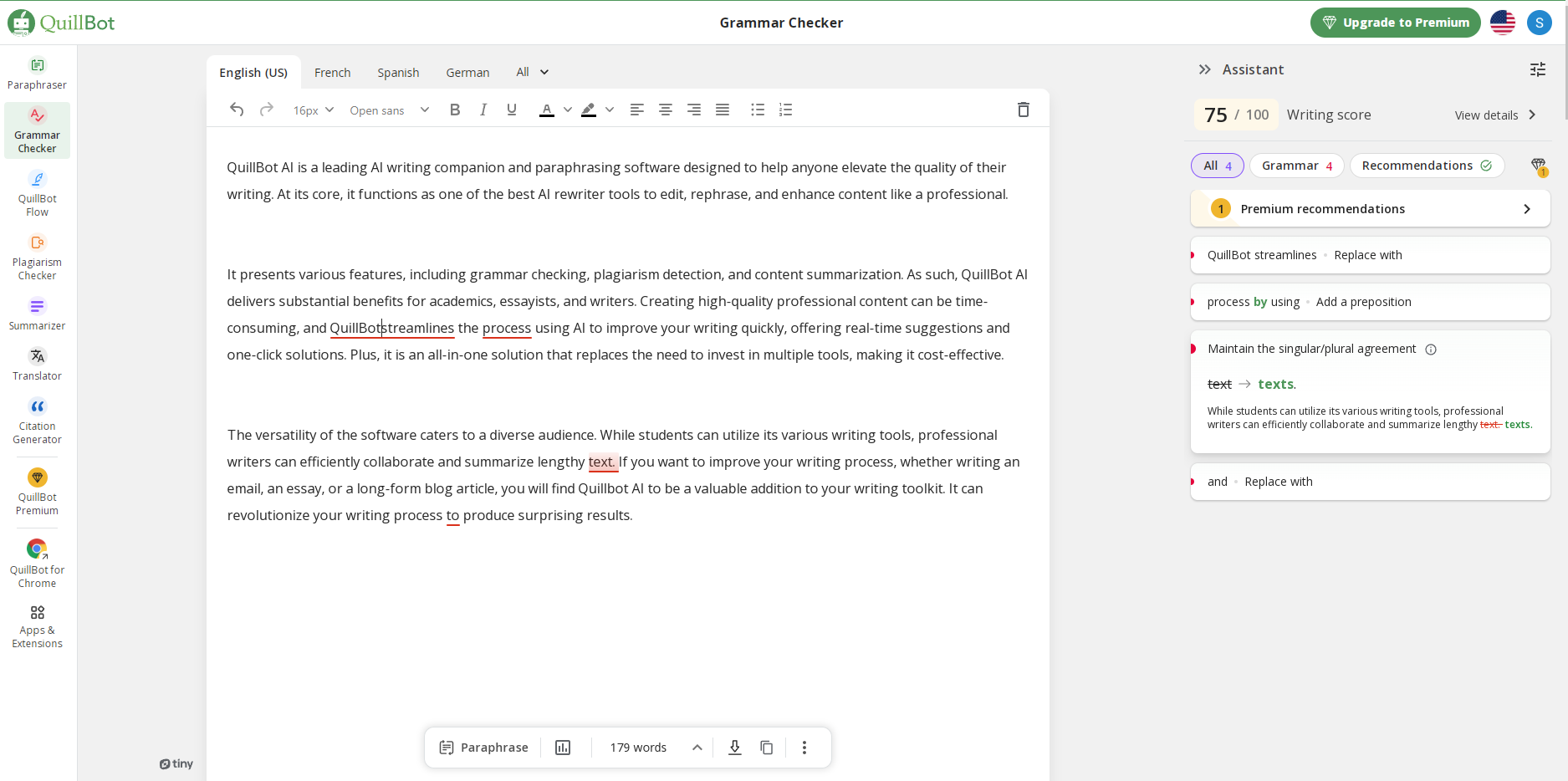 QuillBot هي واحدة من أفضل الأدوات المتاحة لإعادة صياغة النصوص وتلخيصها بشكل تلقائي بالإضافة إلى التدقيق اللغوي. تمنحك QuillBot القدرة على كتابة جملة واحدة ومن ثم إعادة صياغتها بطريقة تحتفظ بالمعنى الأصلي. تعتبر الخدمة آمنة وسهلة الاستخدام.