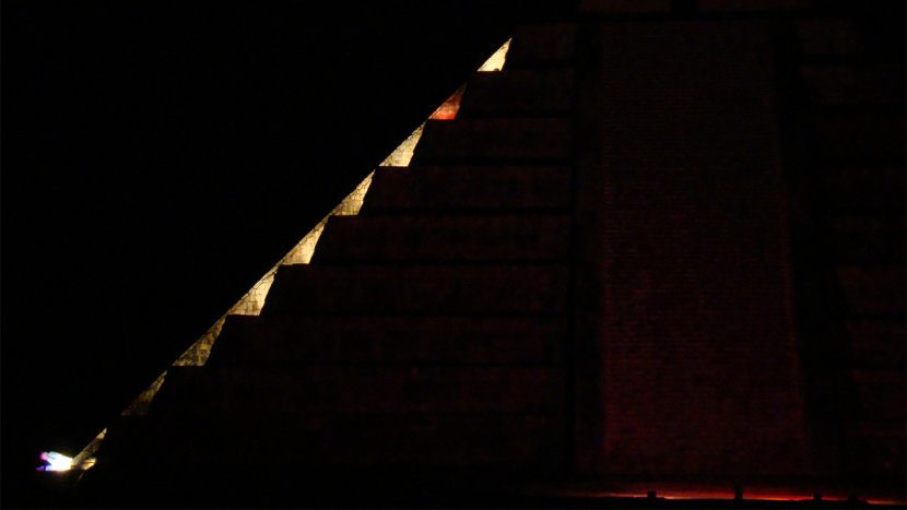 وفي هذه الأوقات تكون الشمس وقت الغروب مقابلة للناحية الشمالية الغربية للمعبد، لتنعكس الظلال المثلثة على المدرج وتنتهي عند رأس الثعبان المزخرف ليبدو وكأنه ثعبان ذو ريش ينحذر إلى أسفل الهرم.