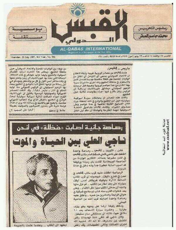 مع بداية الانتفاضة الفلسطينيّة الأولى وبينما كان ناجي العلي في طريقه إلى مقر عمله في جريدة القبس الدولية، يوم 22 يوليو/تموز 1987، أطلق شاب مجهول النار عليه فأصابه تحت عينه اليمنى، ما أدى لدخوله في غيبوبة بالمستشفى، حتى وفاته في 29 أغسطس/آب في العام ذاته.