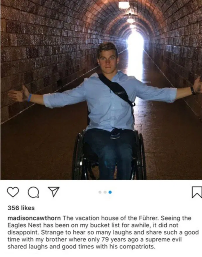 في عام 2017 نشر كاوثورن عدّة صور له على موقع Instagram وهو يحتفل في نفق “عش النسر” الذي يقال إنه كان إحدى النقاط التي كان يقضي فيها هتلر عطلته في جبال الألب.