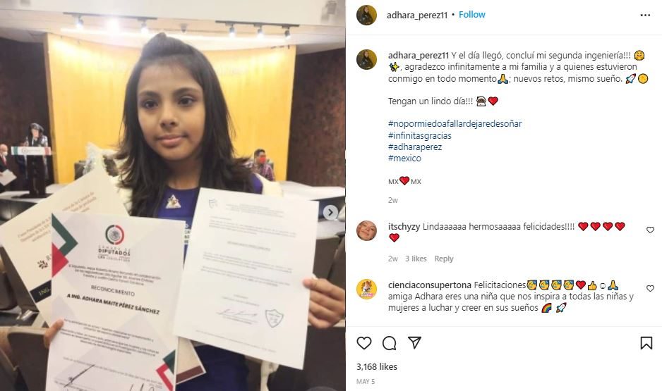 بالإضافة إلى ذلك، منحت جامعة أريزونا مكاناً لأدارا بيريز. وفي الوقت الحالي، تواظب الطفلة على دراسة اللغة الإنجليزية من أجل اختبار الدخول، وتواصل تنمية اهتماماتها بالفيزياء الفلكية. فهي تطمح لأن تصبح رائدة فضاء، وأن تعمل ذات يوم في وكالة ناسا.
