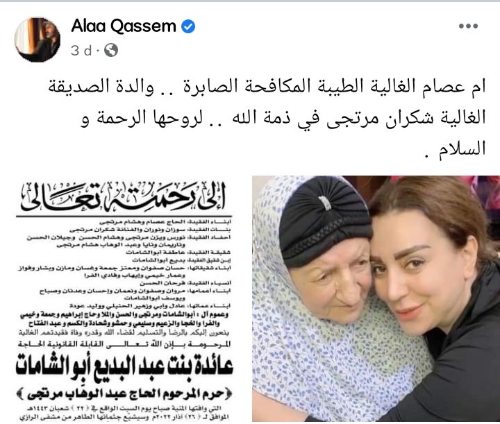 في خطوةٍ لافتة، حضر الممثل السوري علاء قاسم لتقديم واجب العزاء لطليقته الممثلة السورية شكران مرتجى، التي توفيت والدتها قبل أيام، والتي كان سبق له أن نشر ورقة النعي عبر صفحته الخاصة على فيسبوك بعد انتشار خبر الوفاة.