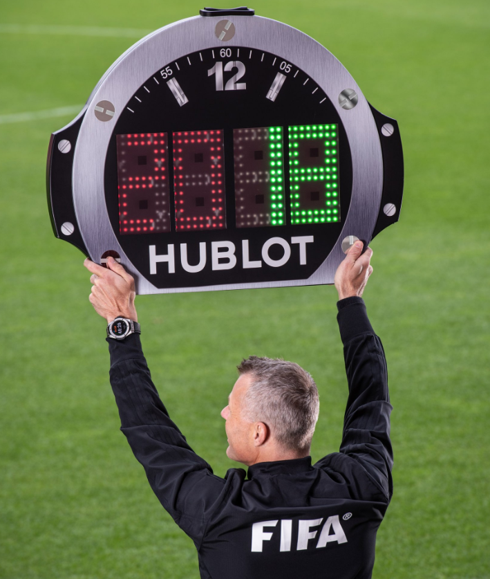 وفي سياقٍ آخر، ساعات Hublot كانت الراعي الرسمي لكأس العالم 2018، وكان اسمها يتصدّر الساعة الكبيرة التي كان يحملها حكّام مباريات كرة القدم، خلال تبديل اللاعبين أو إعطاء الوقت الإضافي للمباراة.