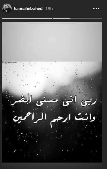 وشاركت الآية القرآنية: «ربي أإنِّي مَسَّنِيَ الضُّرُّ وَأَنتَ أَرْحَمُ الرَّاحِمِينَ». كما وجهت الشكر لمتابعيها وكل من حاول الاطمئنان عليها، بكتابة: «شكراً لكل المكالمات والرسائل التي تلقيتها».