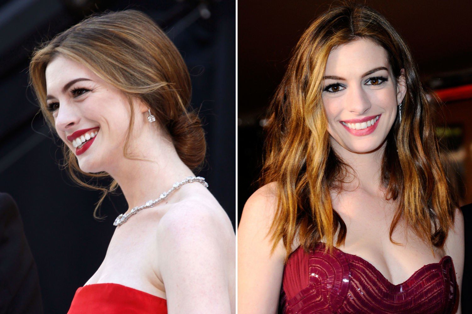 آن هاثواي تدرك أيضاً سحر التسريحات البسيطة لذلك نراها في هذه الصور تارة بشعر مفرود ذي تموجات خفيفة، وتارة بتسريحة بسيطة تجمع فيها شعرها إلى الأسفل وفي الحالتين تبدو شديدة الأناقة.
