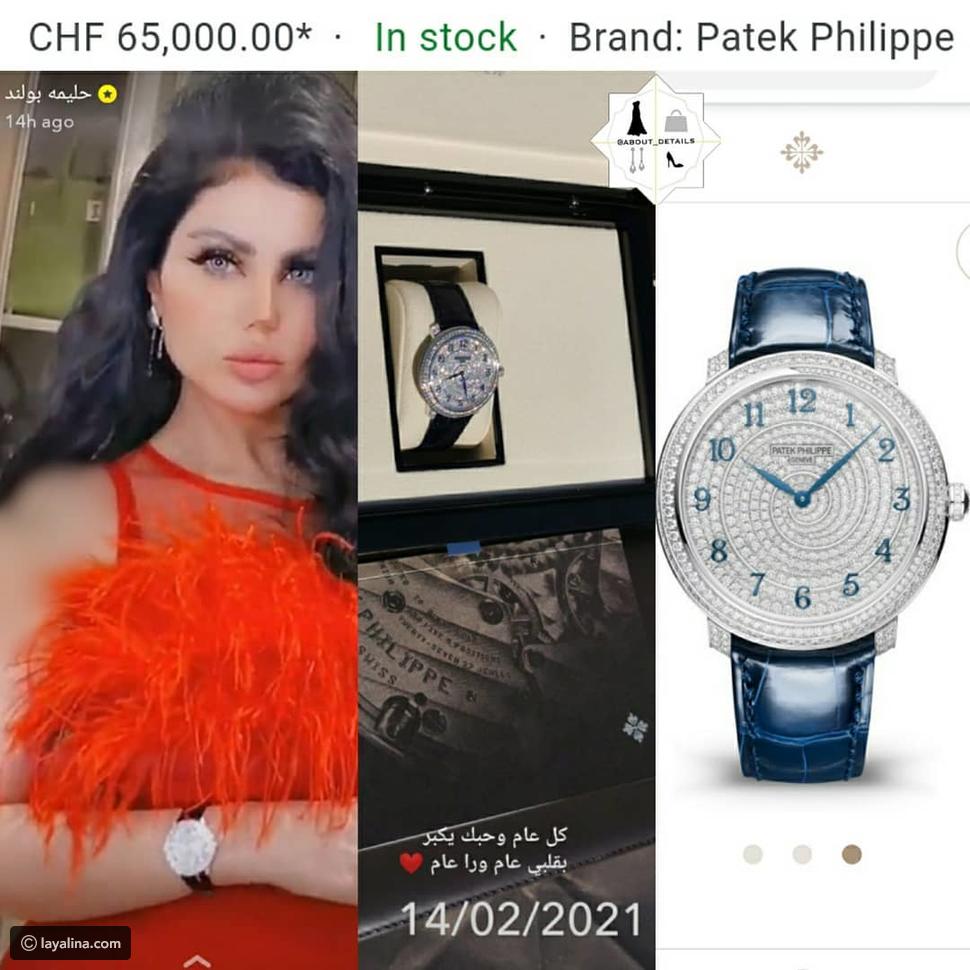حليمة بولند نشرت صورة تستعرض فيها ساعة يد مُرصعة بالألماس، وعلقت على الصورة قائلة: “لا خلا لا عدم يا حبي الأبدي، الساعة من ماركة Patek Philippe الساعة مصنوعة من الذهب الأبيض 18 قيراط ومرصعة بـ770 قطعة ألماس على شكل شريط حلزوني”.