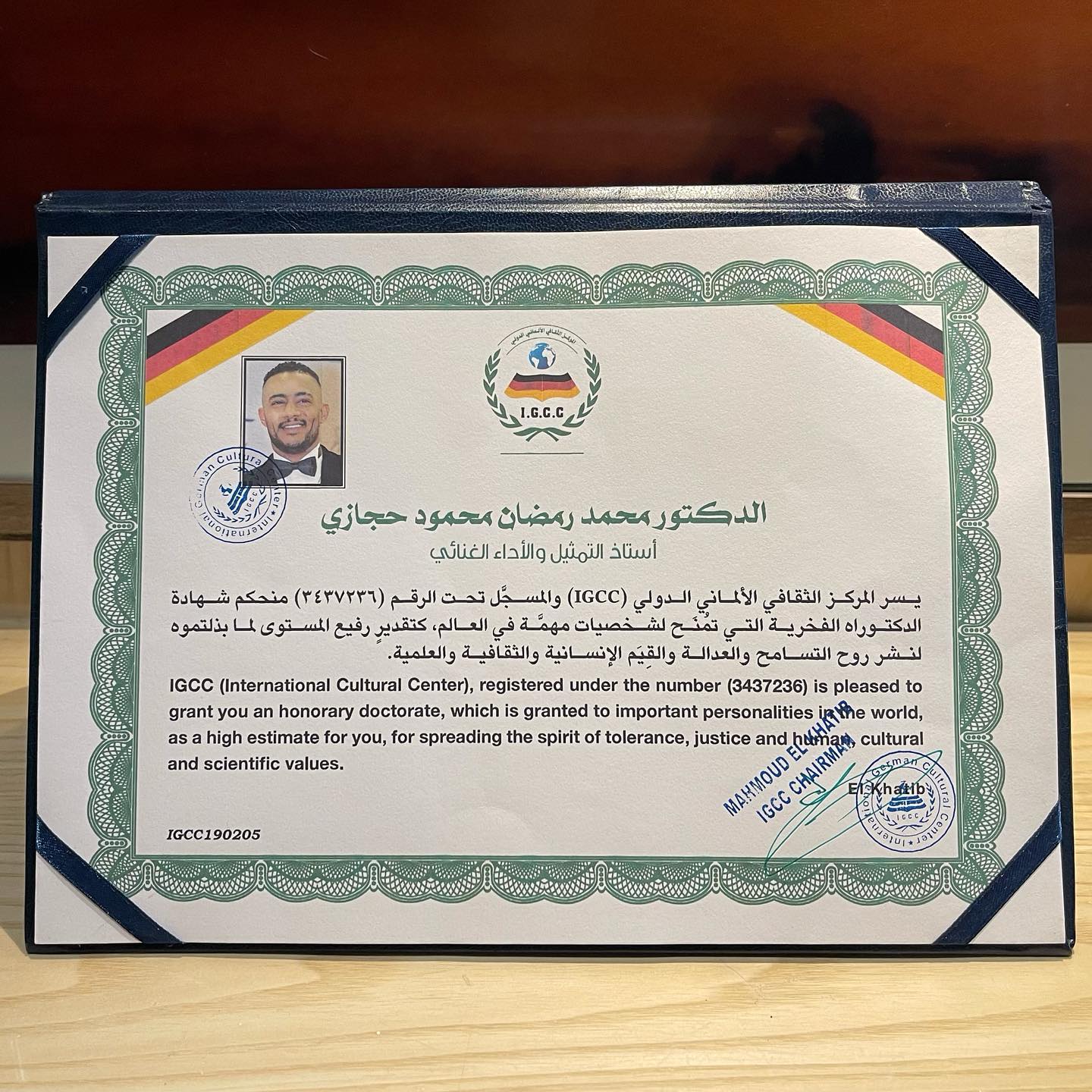 فيما جاءت شهادة لقب “سفير الشباب” موقعة بأسماء كل من وزير الثقافة عباس مرتضى، ونقيب ممثلي المسرح والسينما والإذاعة عبدالرحمن الشامي، ونقيب محترفي الموسيقى والغناء فريد بوسعيد.
