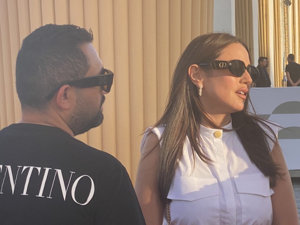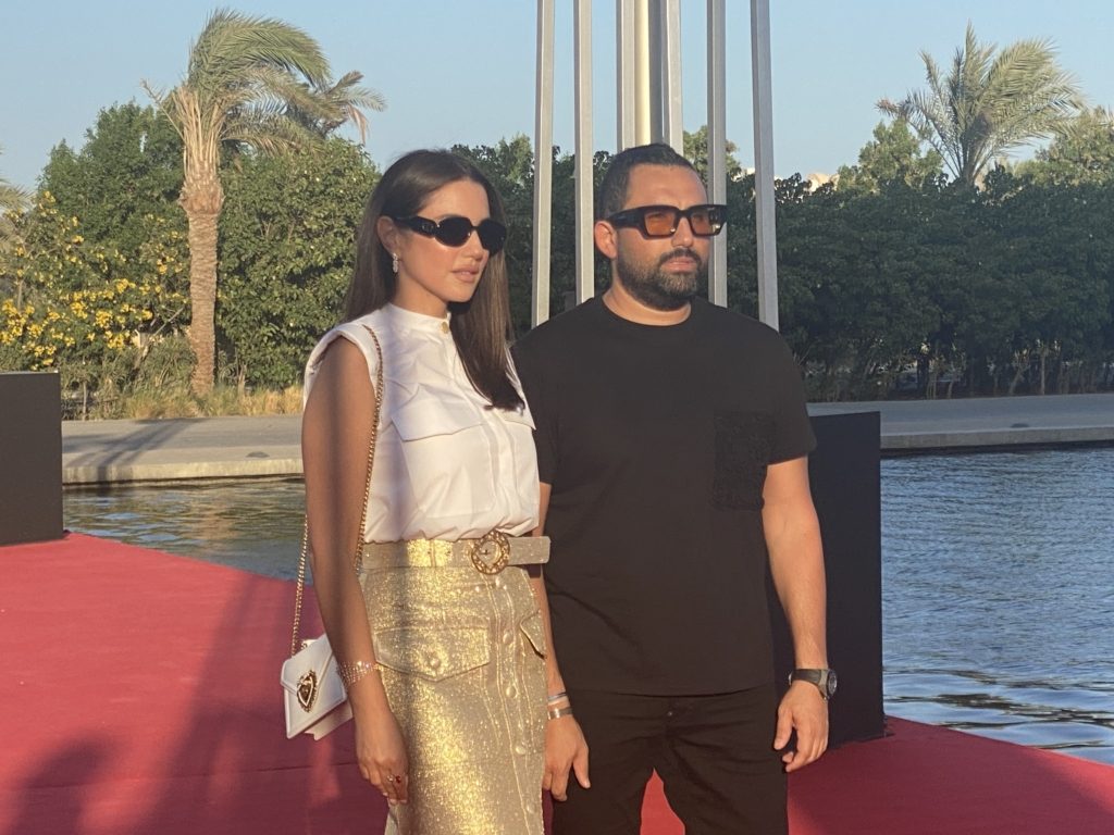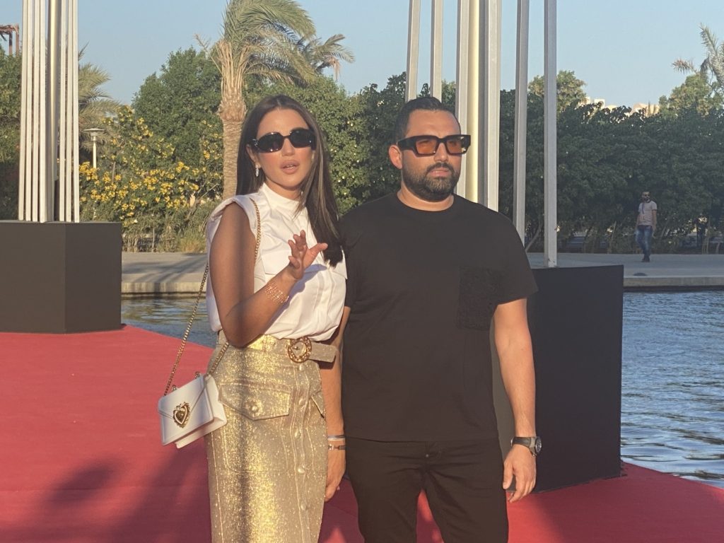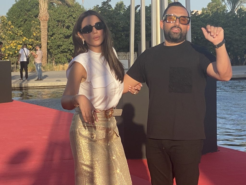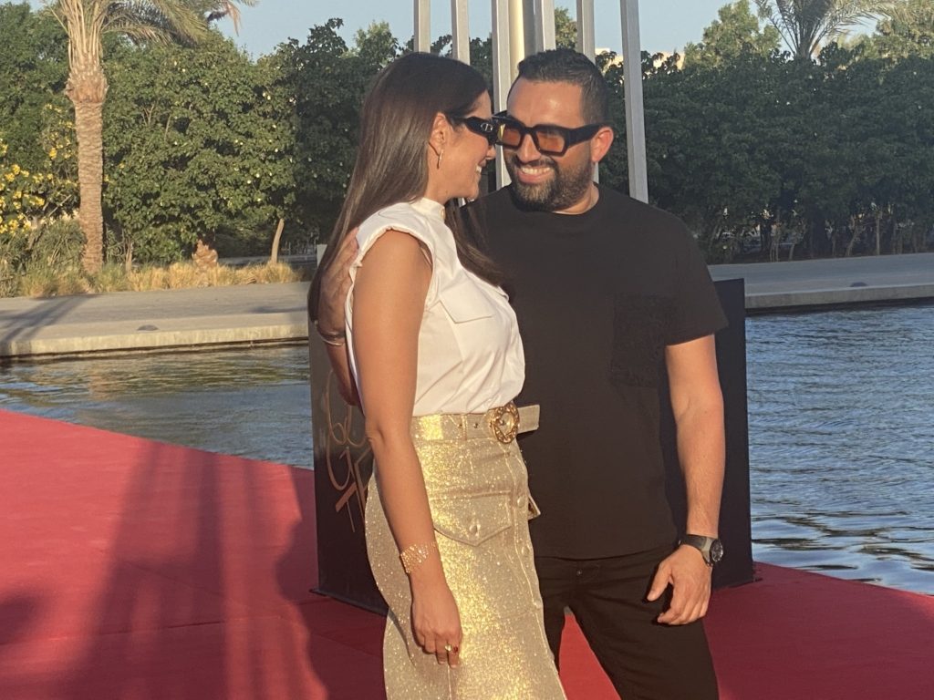 وقد أطلَّت درة خلال الجلسة الحوارية، بقميص أبيض بسيط مع جيبة باللون الذهبي، فيما ارتدى زوجها قميص كاجوال قطنياً أسود اللون.