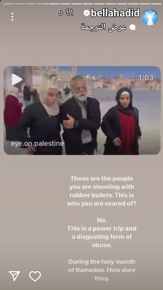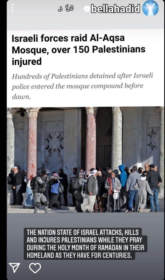 أدانت عارضة الأزياء الأمريكية من أصول فلسطينية بيلا حديد، جنود الاحتلال الإسرائيلي والجرائم التي يرتكبونها بحق المصلين في المسجد الأقصى بالقدس، من خلال نشرها العديد من الصور والفيديوهات عبر خاصية "الستوري" بحسابها الشخصي على "إنستغرام".