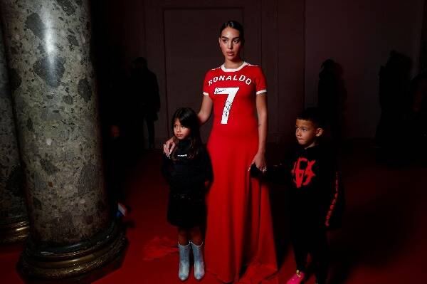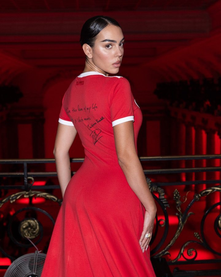 وسارت جورجينا على المدرج بفستانها الأحمر الزاهي، الذي يصل طوله إلى الأرض، ويبدو أنه موقّع من قِبل اللاعب العالمى، وأكملت إطلالتها بارتداء حذاء مصمَّم بكعب أسود.