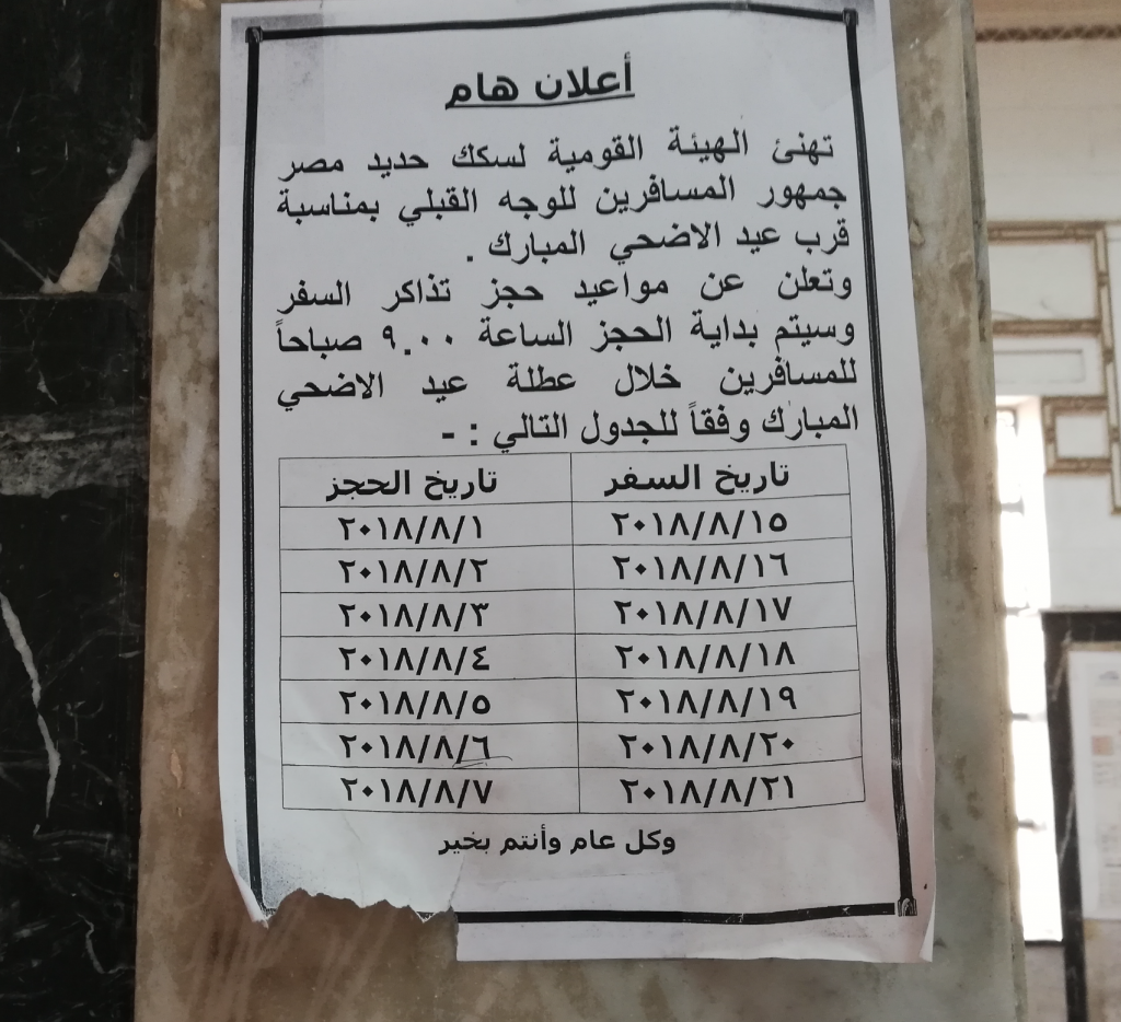 وكانت هيئة سكك حديد مصر الحكومية أعلنت فتح الحجز على تذاكر قطارات العيد بدءاً من الأول من أغسطس/آب ولمدة أسبوع، وعلقت منشورات في المحطات بهذه الإعلان. لكن كثيرين لم يحاطوا علماً بالأمر ومن بينهم إبراهيم.